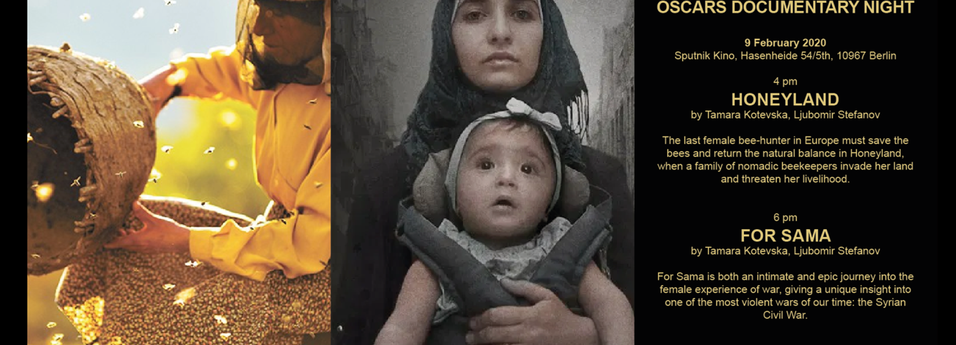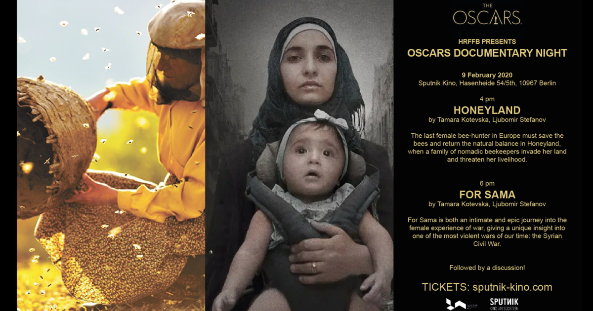 Das Human Rights Film Festival Berlin freut sich sehr, in Kooperation mit dem Sputnik Kino am Südstern seinen Eröffnungsfilm FOR SAMA sowie die außergewöhnlichen Dokumentation HONEYLAND anlässlich der Vergabe der Oscars am 9. Februar 2019 zu präsentieren.
