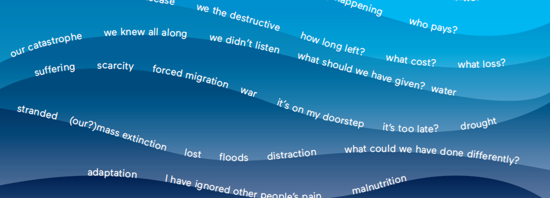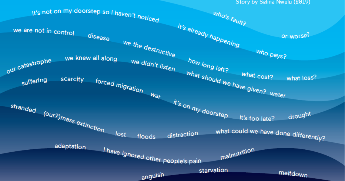 In a series of six poems, Selina Nwulu takes loneliness as a starting point to address the climate crisis, giving viewers the opportunity to perceive her poetry on three levels: visually, in the visual translation of her poems into graphics; audially, with recordings of the poems played at the entrance to the installation; and intellectually, as the texts open up the possibility of engaging further with the subject matter.